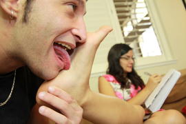 Mar 27 - Another day of relaxing for Mistress Eve. She lounges on her couch while her lucky foot stool lays in his place beneath her. She leaves him no choice but to breath through her feet.