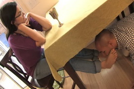 Feb 26 - Mistress Eve attempts to enjoy her drink while slave connor is down beneath her table licking her toes .