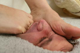 Sep 19 - Mistress Eve uses her bare feet to play with her slave's face, smooshing his face all around with them. She makes him sniff her stinky soles, and shoves her toes into his wide open mouth.