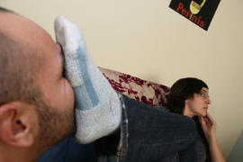 Aug 26 - Slave Connor is kneeling at Mistress Eve's feet, sniffing her well worn socks. He takes her socks off using only his mouth, and adoringly worships her beautiful bare feet.