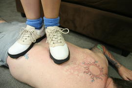 Jan 28 - Mistress Eves human floor is in for a special treat today. Dressed in blue socks with white soccer cleats, she tramples every part of his body, leaving bright red marks everywhere! She squishes his stupid face as hard as she can between her two cleat covered feet and jumps up and down on his back.